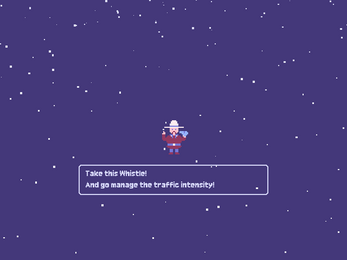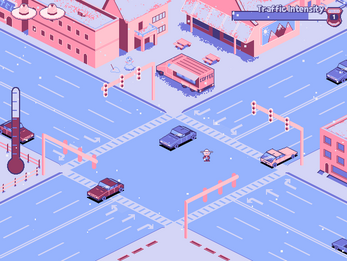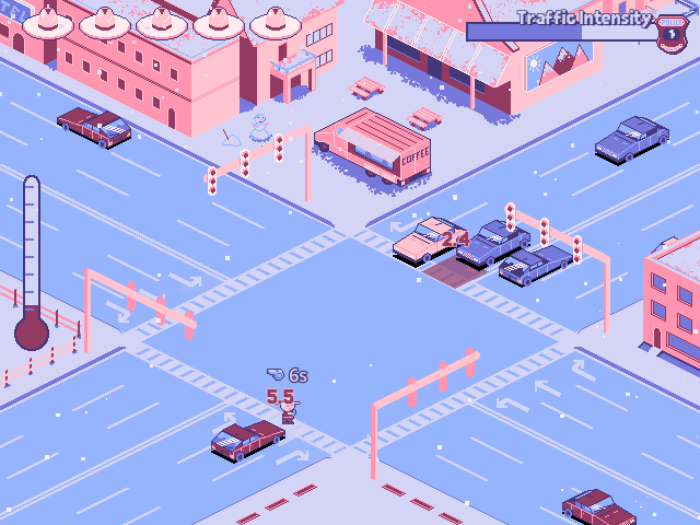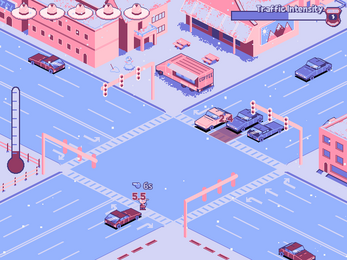 At first, we considered a Titanic-themed game where you had to be rescued before freezing. Then, we explored the idea of a shepherd dog game, controlling your best friend with a whistle as a blizzard approaches. Finally, we settled on the story of an old Canadian policeman who must manage Traffic Intensity.